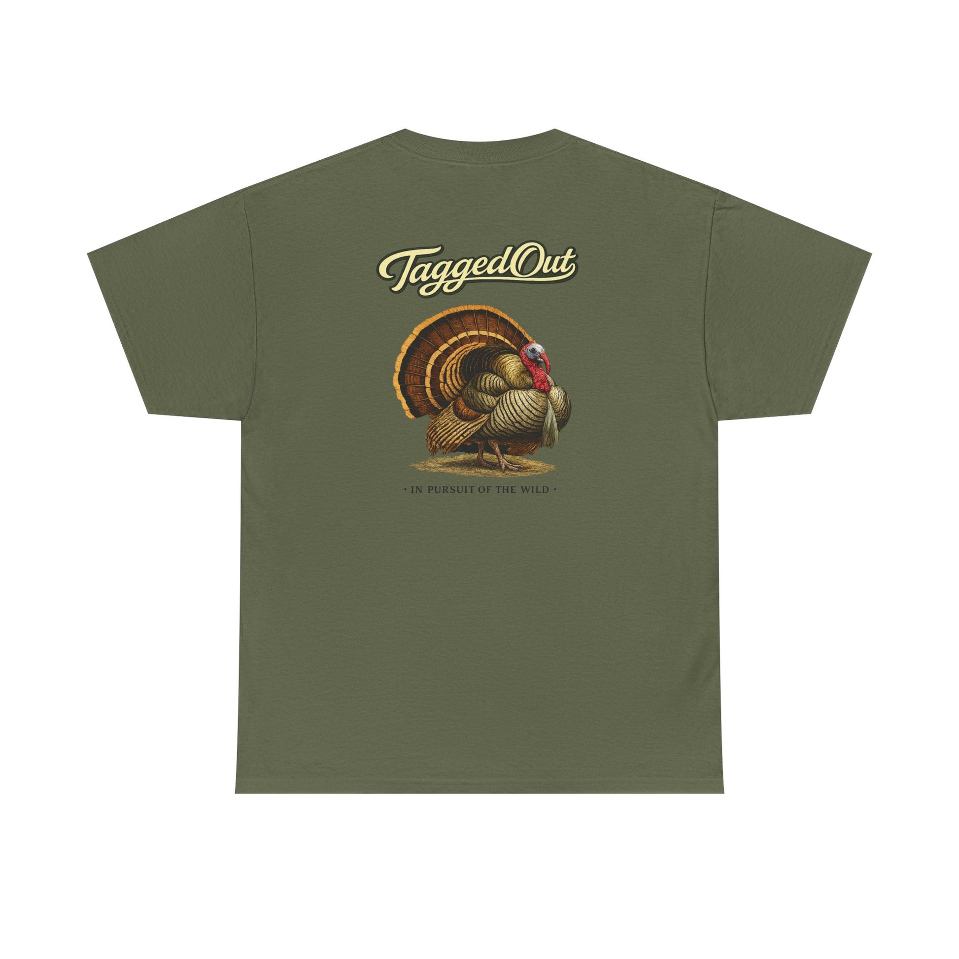 Featuring a bold strutting turkey graphic with our signature TaggedOut script and In Pursuit of the Wild below. Clean, classic, and built for those who live for spring mornings and long sits against an old oak.